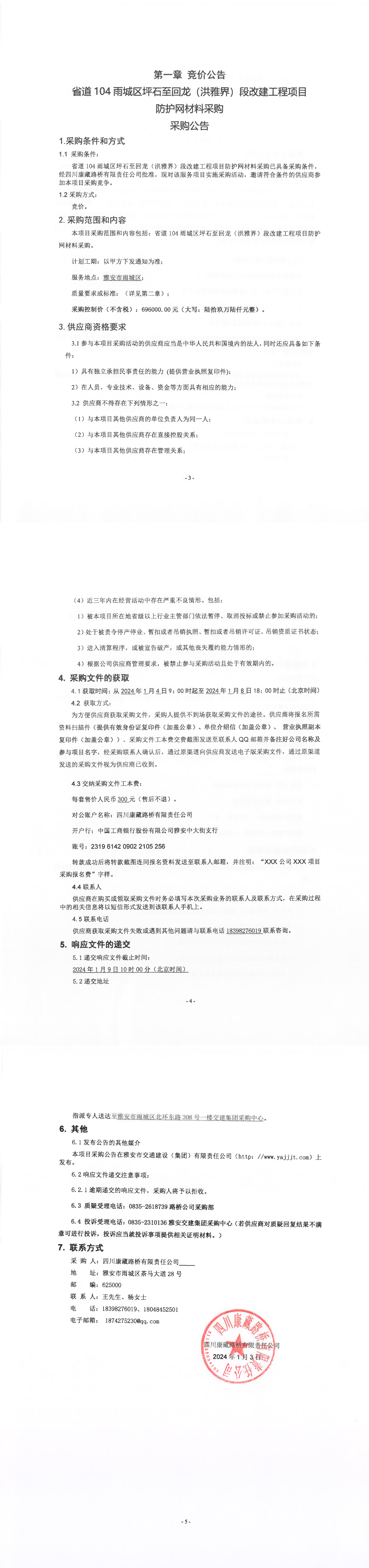 四川康藏路橋有限責任公司省道104雨城區(qū)坪石至回龍(洪雅界)段改建工程項目防護網材料采購公告