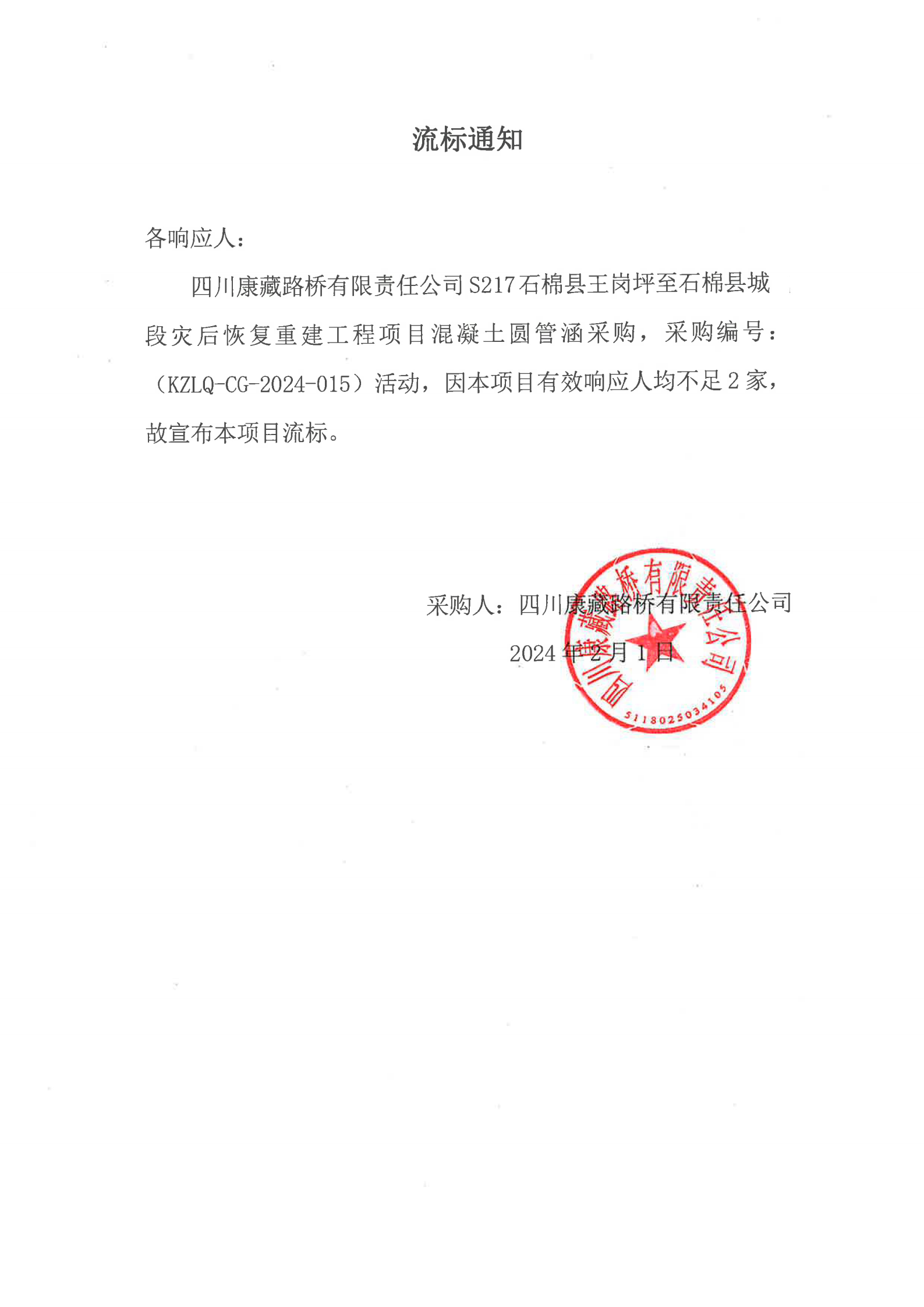 四川康藏路橋有限責(zé)任公司S217石棉縣王崗坪至石棉縣城段災(zāi)后恢復(fù)重建工程項目混凝土圓管涵采購流標(biāo)通知