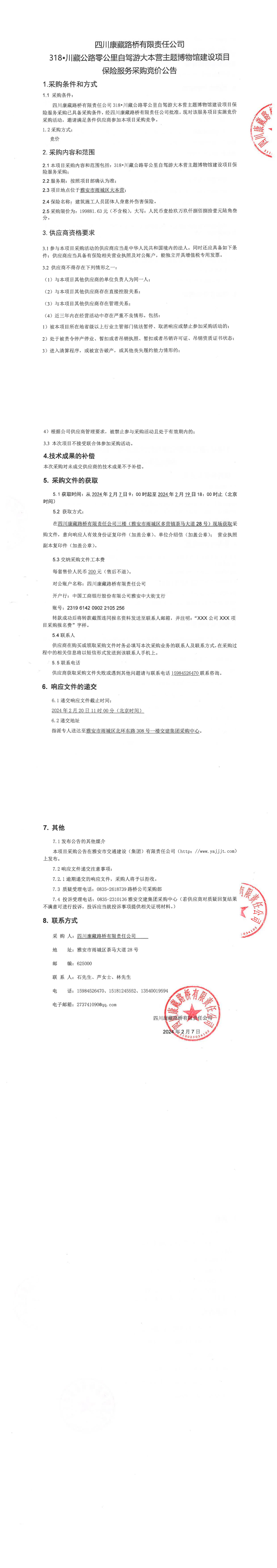 四川康藏路橋有限責(zé)任公司318•川藏公路零公里自駕游大本營主題博物館建設(shè)項(xiàng)目保險服務(wù)采購公告