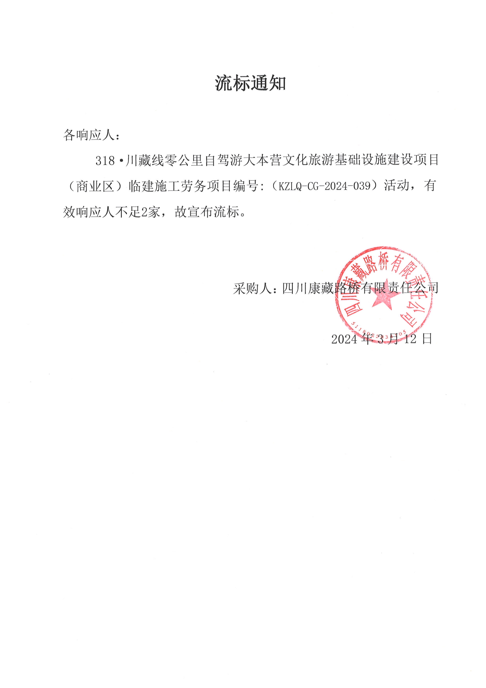 四川康藏路橋有限責(zé)任公司318·川藏線零公里自駕游大本營文化旅游基礎(chǔ)設(shè)施建設(shè)項目(商業(yè)區(qū))臨建施工勞務(wù)流標(biāo)通知