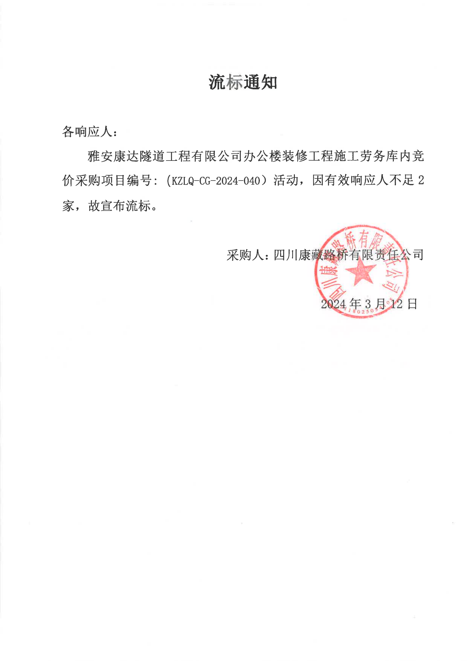 雅安康達(dá)隧道工程有限公司辦公樓裝修工程施工勞務(wù)庫(kù)內(nèi)競(jìng)價(jià)采購(gòu)流標(biāo)通知