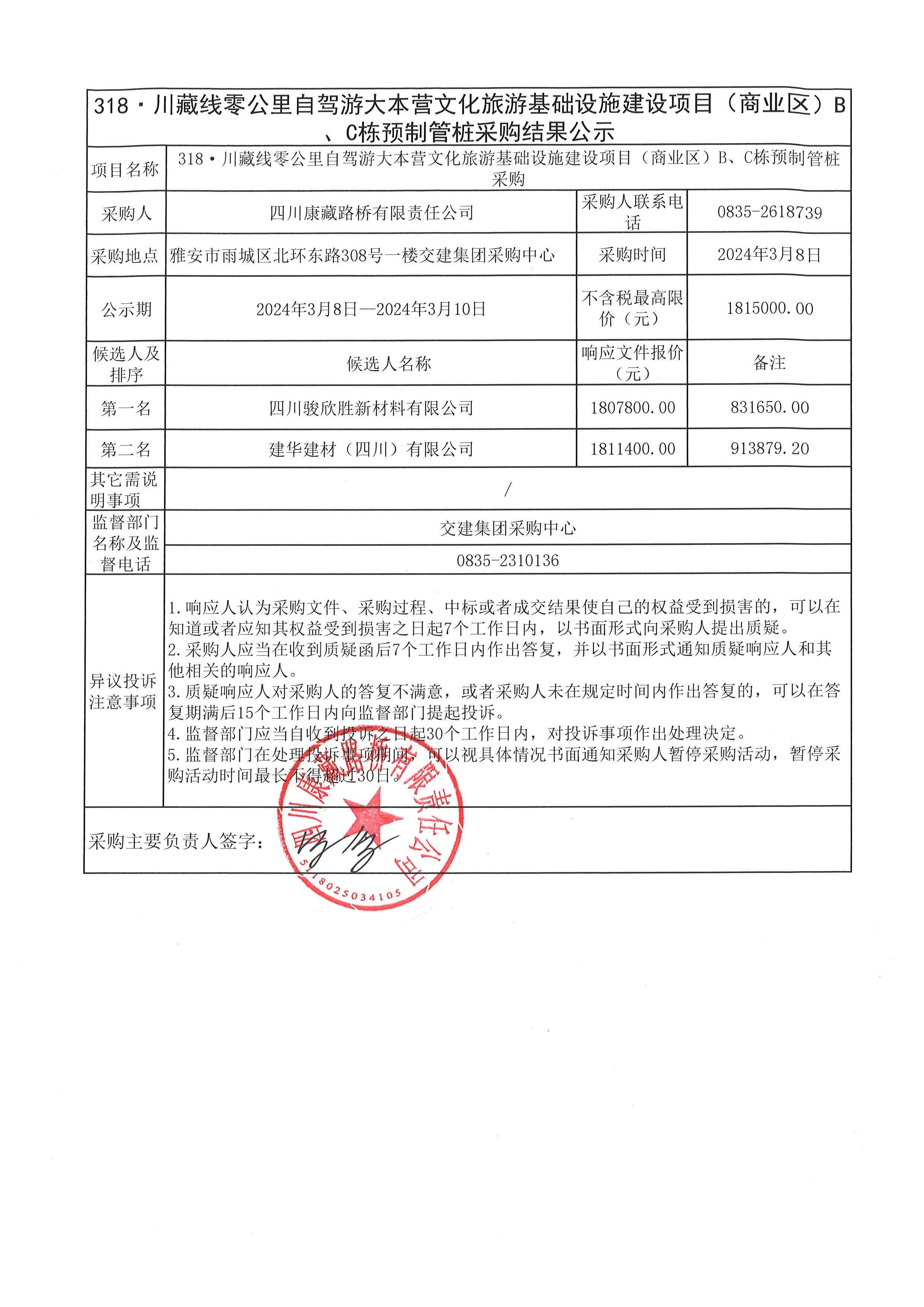 四川康藏路橋有限責(zé)任公司318·川藏線零公里自駕游大本營文化旅游基礎(chǔ)設(shè)施建設(shè)項(xiàng)目(商業(yè)區(qū))B、C棟預(yù)制管樁采購結(jié)果公示
