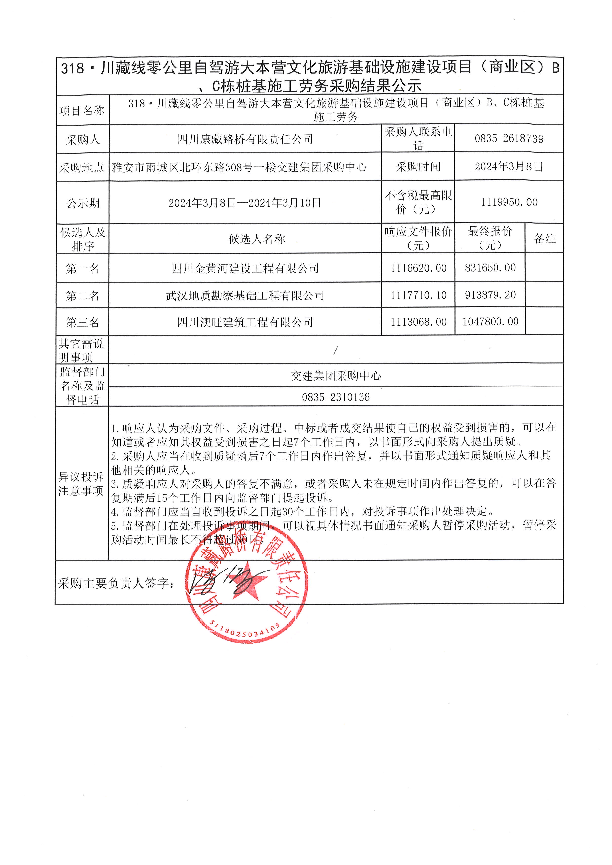 四川康藏路橋有限責任公司318·川藏線零公里自駕游大本營文化旅游基礎設施建設項目(商業(yè)區(qū))B、C棟預制管樁采購結(jié)果公示