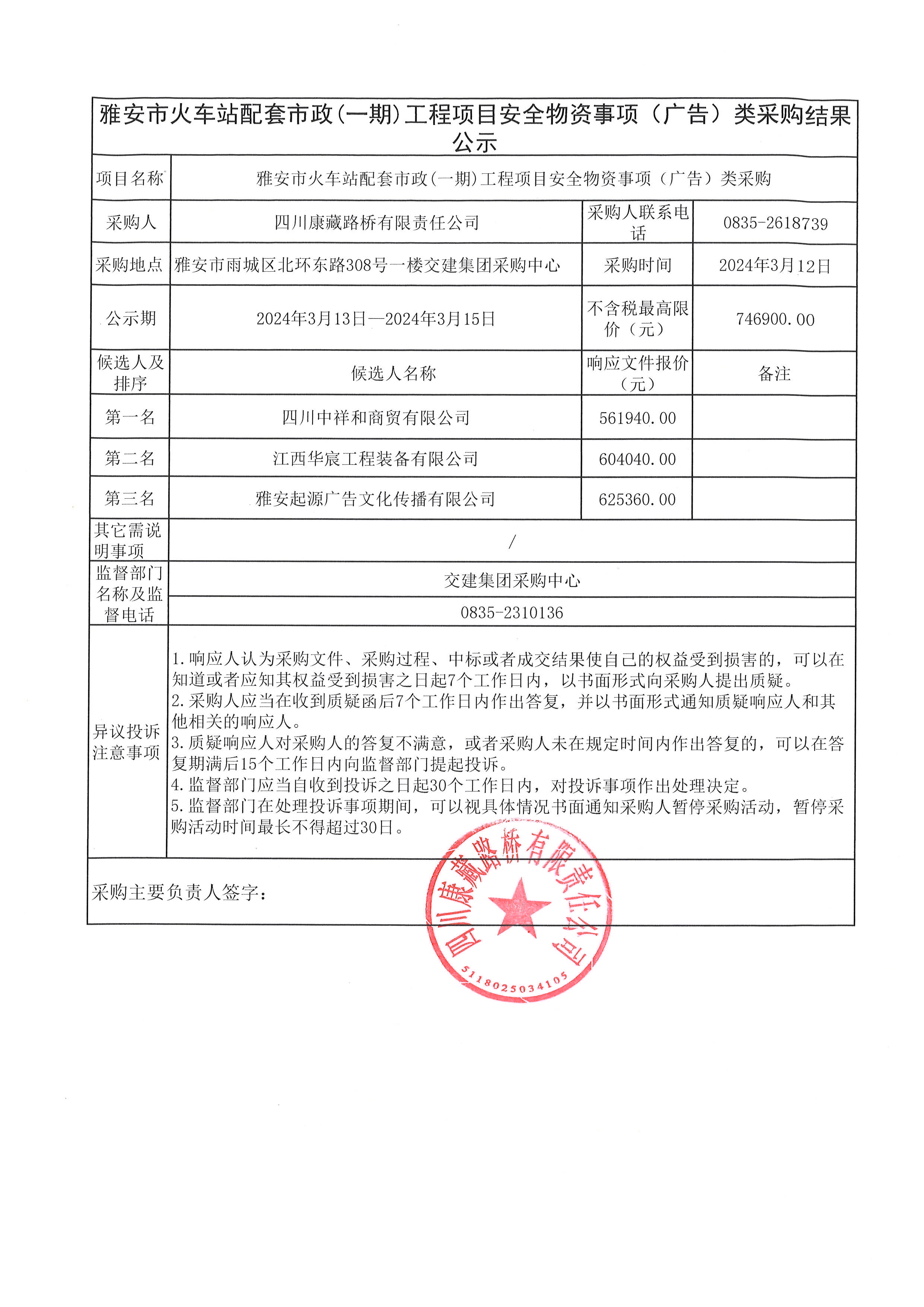 四川康藏路橋有限責(zé)任公司雅安市火車站配套市政(一期)工程項(xiàng)目安全物資(廣告)采購(gòu)結(jié)果公示