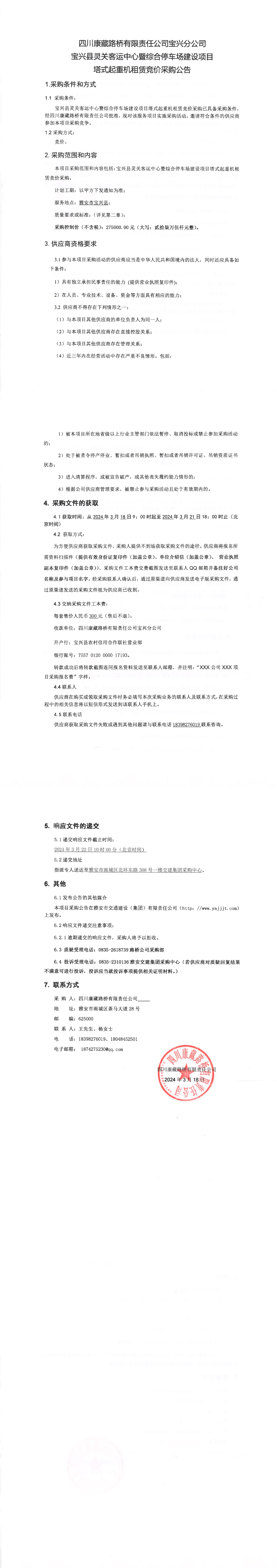 四川康藏路橋有限責(zé)任公司寶興縣靈關(guān)客運(yùn)中心暨綜合停車場建設(shè)項(xiàng)目塔式起重機(jī)租賃競價采購公告