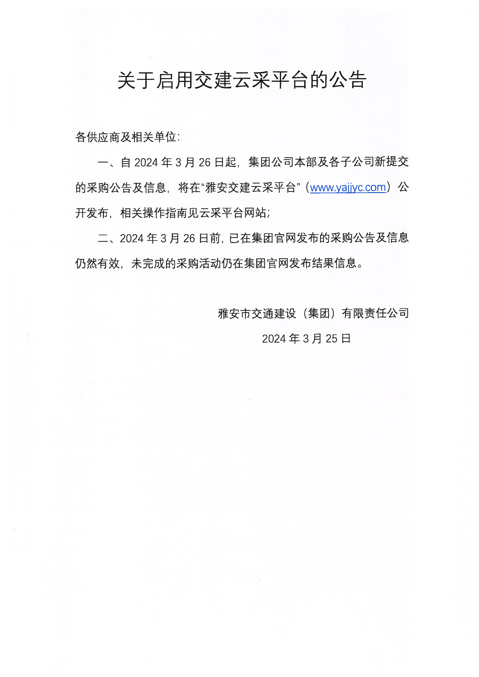雅安市交通建設(shè)(集團(tuán))有限責(zé)任公司關(guān)于啟用交建云采平臺的公告