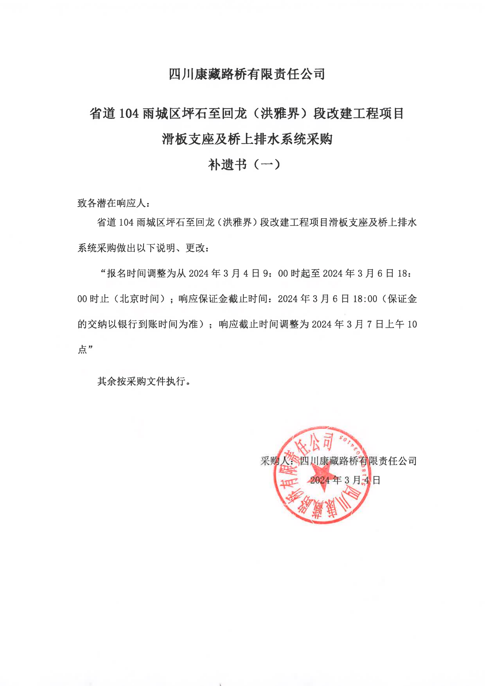 四川康藏路橋有限責(zé)任公司省道104雨城區(qū)坪石至回龍(洪雅界)段改建工程項(xiàng)目滑板支座及橋上排水系統(tǒng)采購補(bǔ)遺書(一)