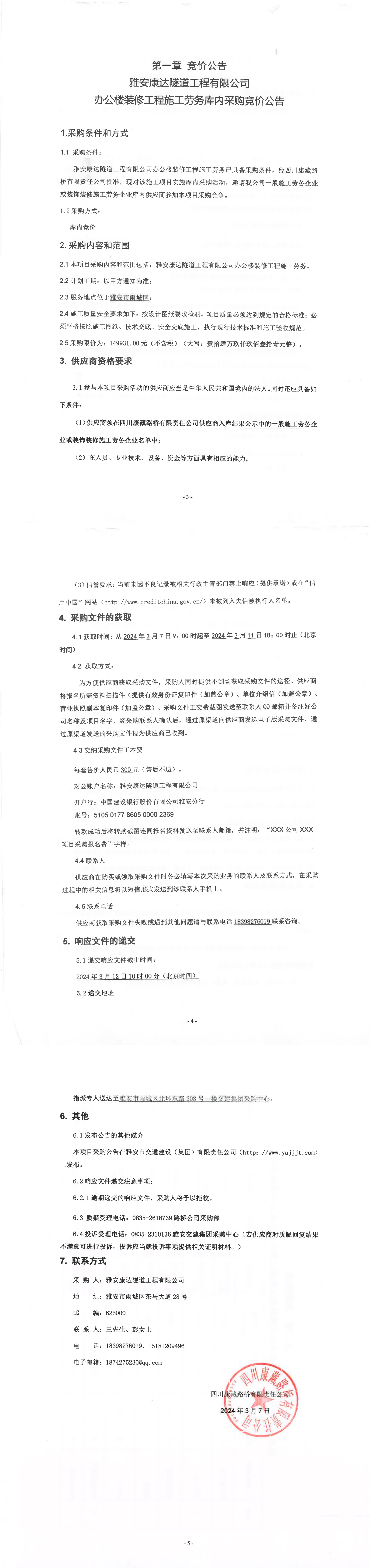 雅安康達(dá)隧道工程有限公司辦公樓裝修工程施工勞務(wù)庫(kù)內(nèi)采購(gòu)競(jìng)價(jià)公告