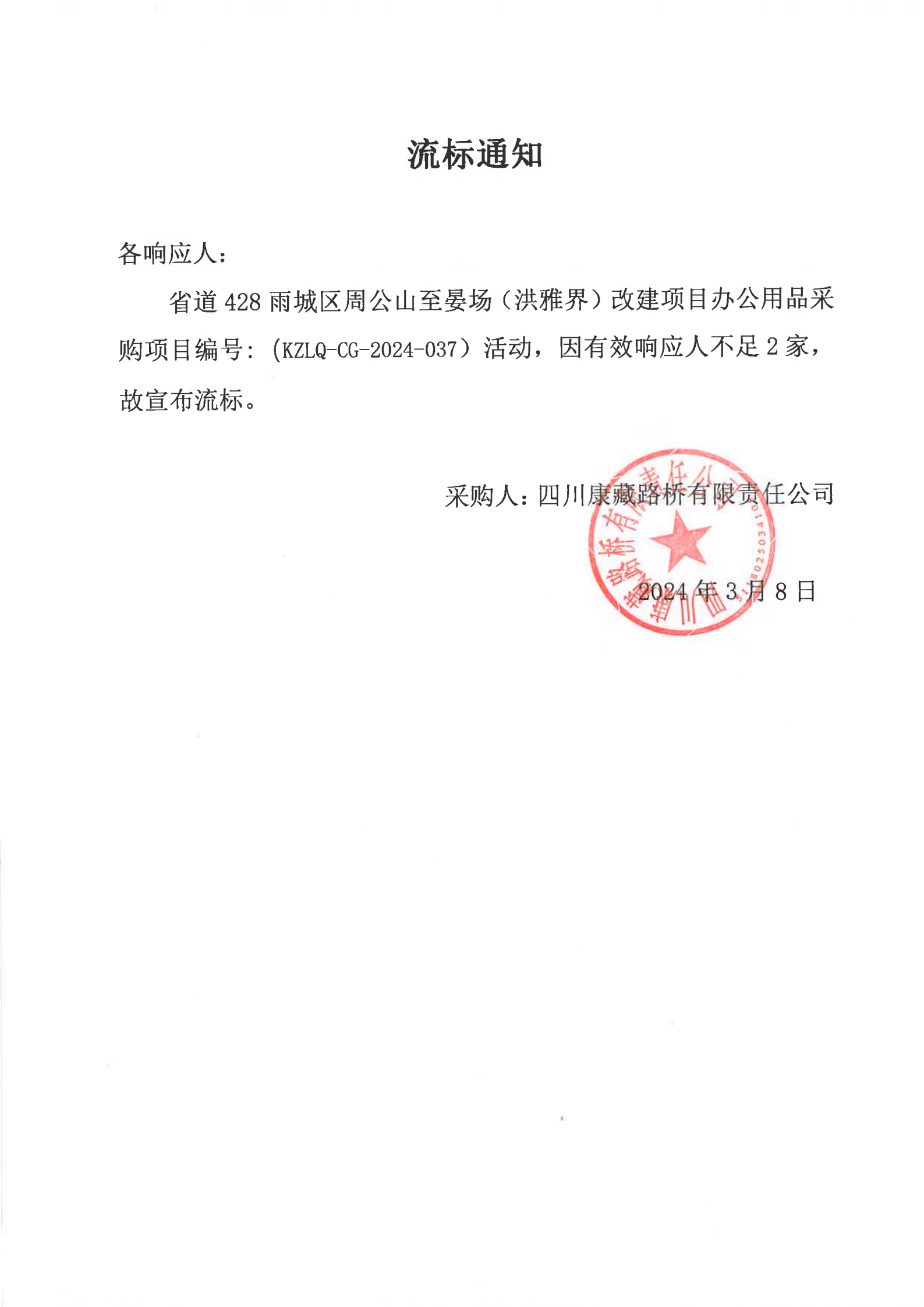 四川康藏路橋有限責(zé)任公司省道428雨城區(qū)周公山至晏場(chǎng)(洪雅界)改建項(xiàng)目辦公用品采購流標(biāo)通知