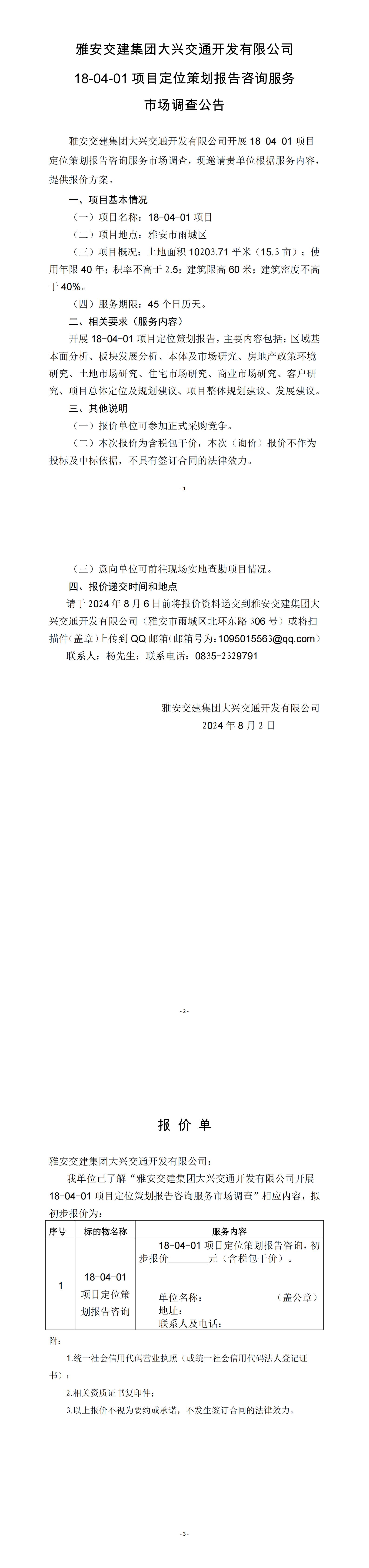 雅安交建集團(tuán)大興交通開(kāi)發(fā)有限公司18-04-01項(xiàng)目定位策劃報(bào)告咨詢服務(wù)市場(chǎng)調(diào)查公告