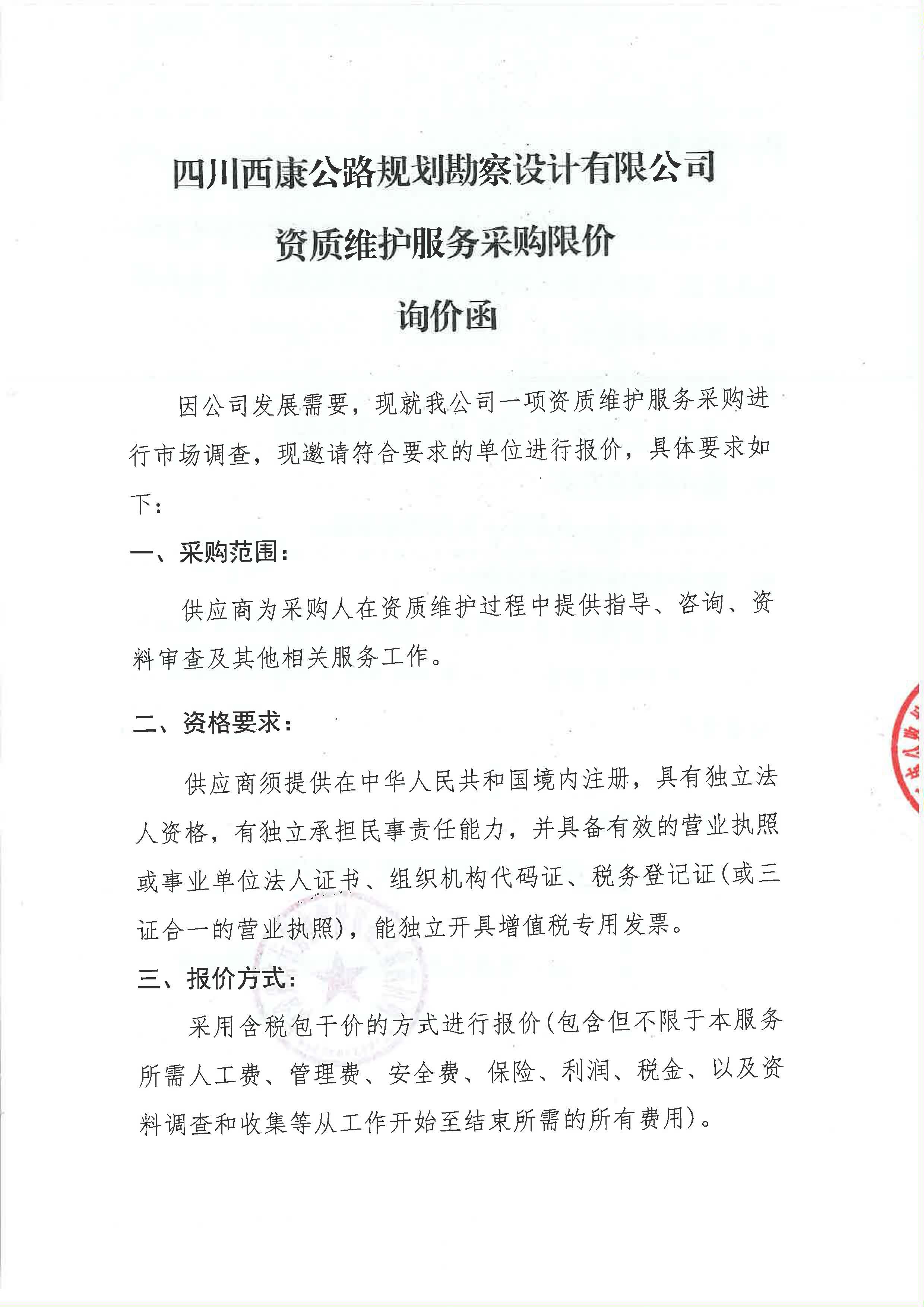 四川西康公路規(guī)劃勘察設(shè)計(jì)有限公司資質(zhì)維護(hù)服務(wù)采購(gòu)限價(jià)詢價(jià)函