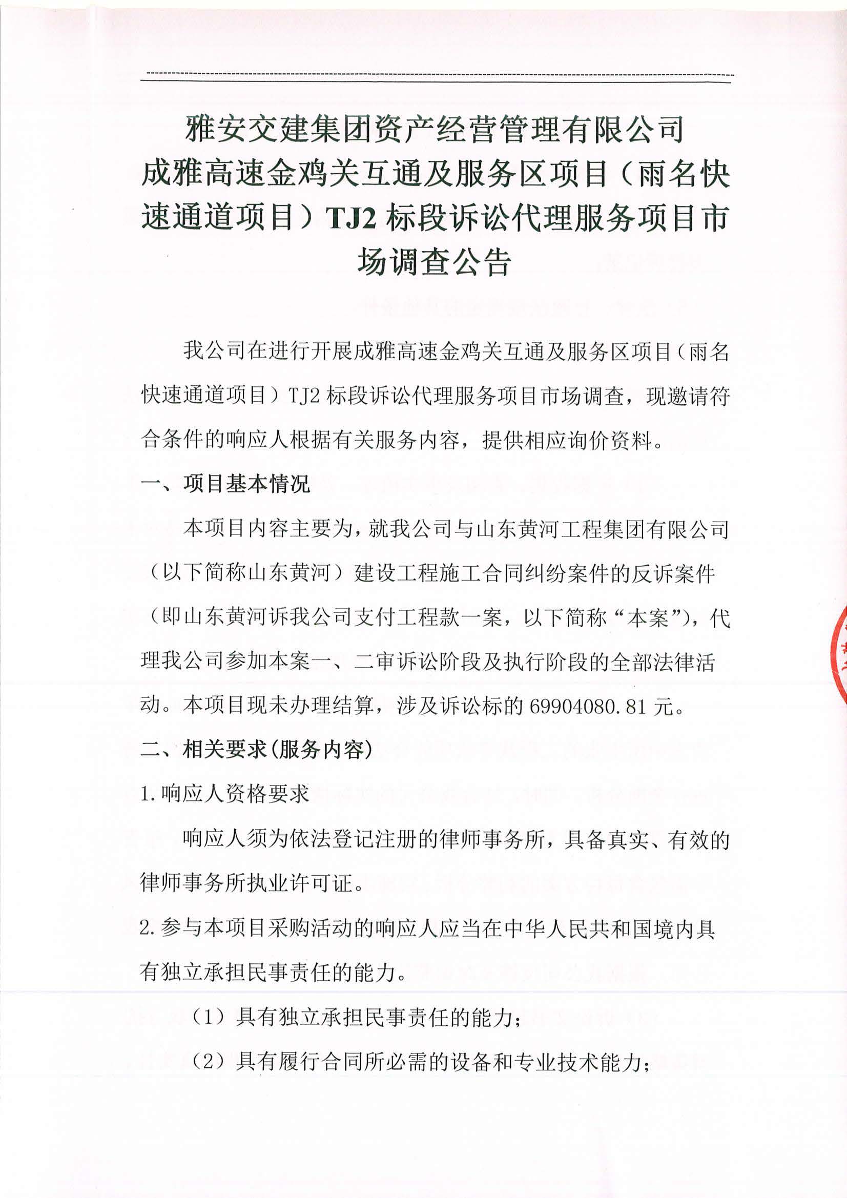 雅安交建集團(tuán)資產(chǎn)經(jīng)營(yíng)管理有限公司成雅高速金雞關(guān)互通及服務(wù)區(qū)項(xiàng)目(雨名快速通道項(xiàng)目)TJ2標(biāo)段訴訟代理服務(wù)項(xiàng)目市場(chǎng)調(diào)查公告