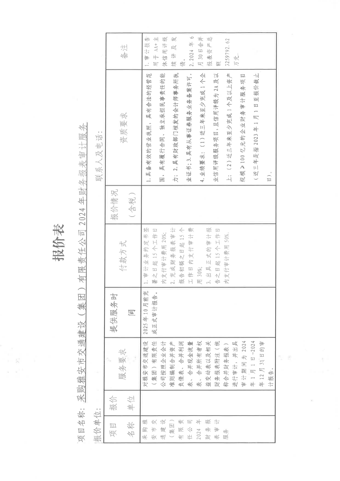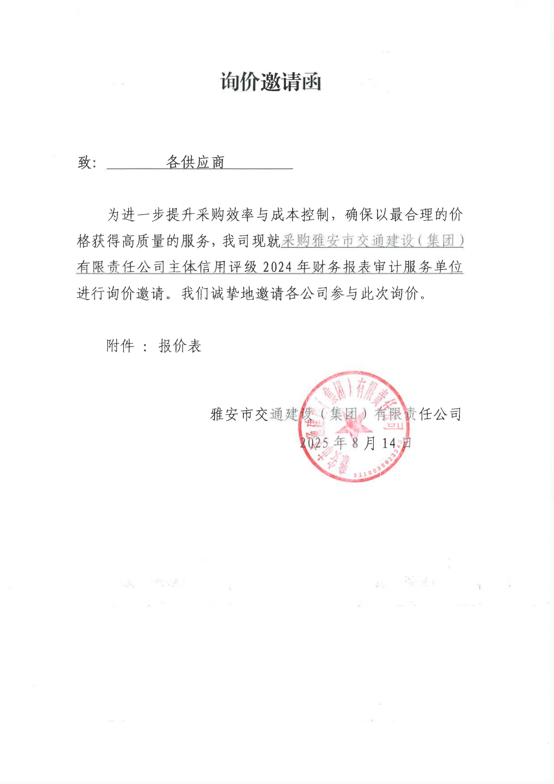 關于采購雅安市交通建設(集團)有限責任公司主體信用評級2024年財務報表審計服務單位的詢價函