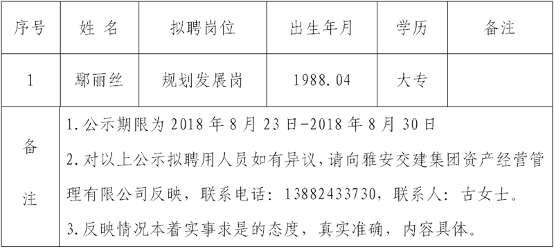 通過公開報名、資格審查、綜合測試等程序,經(jīng)雅安交建集團資產(chǎn)經(jīng)營管理有限公司研究確定以下1名擬聘用人員,現(xiàn)公示名單如下: