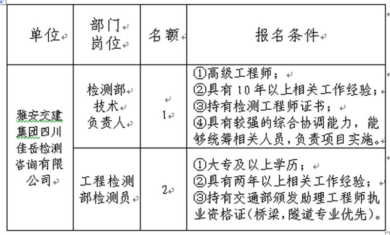 根據(jù)發(fā)展需要,決定面向社會公開招聘雅安市交通建設(集團)有限責任公司(以下簡稱“雅安交建集團”)所屬子公司工作人員3名,現(xiàn)將有關事項公告如下: