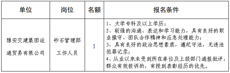 根據(jù)發(fā)展需要,決定面向社會公開招聘雅安市交通建設(shè)(集團(tuán))有限責(zé)任公司(以下簡稱“雅安交建集團(tuán)”)所屬子公司工作人員1名,現(xiàn)將有關(guān)事項公告如下: