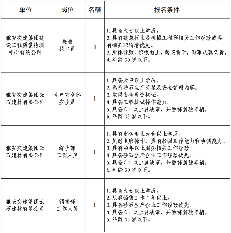 根據(jù)發(fā)展需要,決定面向社會公開招聘雅安市交通建設(集團)有限責任公司(以下簡稱“雅安交建集團”)所屬子公司工作人員6名,現(xiàn)將有關事項公告如下: