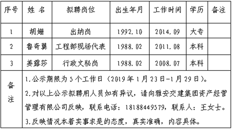 通過公開報(bào)名、資格審查、筆試、面試等程序,經(jīng)雅安交建集團(tuán)資產(chǎn)經(jīng)營(yíng)管理有限公司研究,對(duì)以下