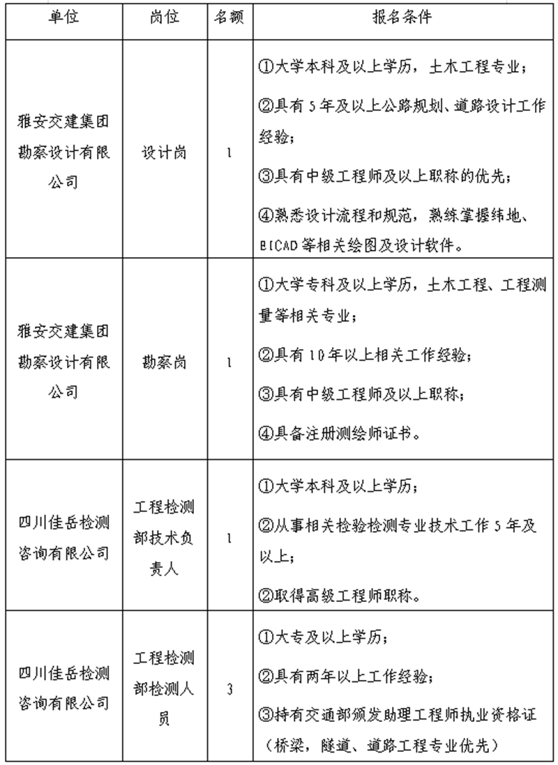 根據(jù)發(fā)展需要,決定面向社會(huì)公開(kāi)招聘雅安市交通建設(shè)(集團(tuán))有限責(zé)任公司(以下簡(jiǎn)稱(chēng)“雅安交建集團(tuán)”)所屬子公司工作人員6名,現(xiàn)將有關(guān)事項(xiàng)公告如下: