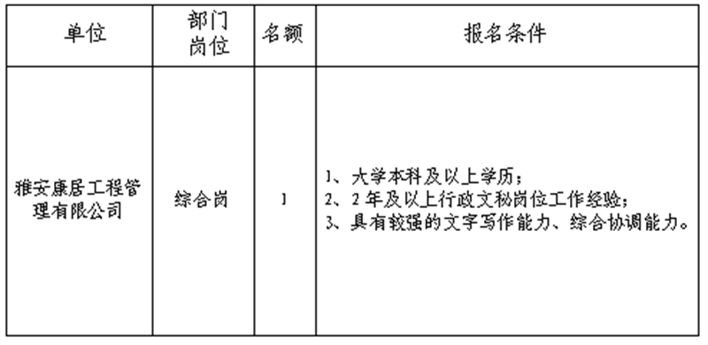 根據(jù)發(fā)展需要,決定面向社會(huì)公開(kāi)招聘雅安市交通建設(shè)(集團(tuán))有限責(zé)任公司(以下簡(jiǎn)稱(chēng)“雅安交建集團(tuán)”)所屬子公司工作人員1名,現(xiàn)將有關(guān)事項(xiàng)公告如下: