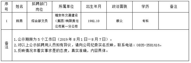 雅安交建集團子公司擬聘用人員公示(第一分公司)