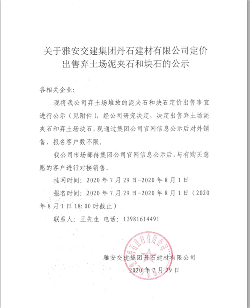 關(guān)于雅安交建集團(tuán)丹石建材有限公司定價(jià)出售棄土場泥夾石和塊石的公示