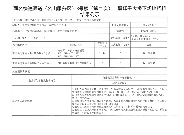 雅安交建集團(tuán)交通資源開發(fā)有限責(zé)任公司雨名快速通道(名山服務(wù)區(qū))3號樓(第二次)黑碾子大橋下場地招租結(jié)果公示