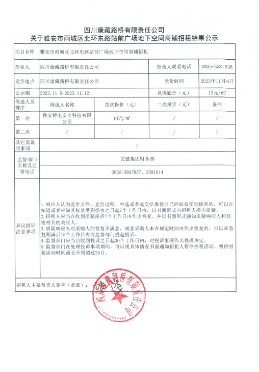 四川康藏路橋有限責任公司關于雅安市雨城區(qū)北環(huán)東路站前廣場地下空間商鋪招租結果公示