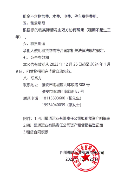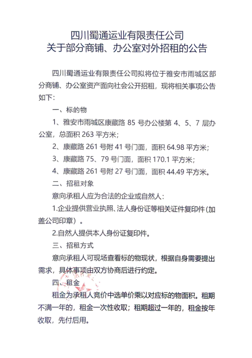 四川蜀通運業(yè)有限責(zé)任公司關(guān)于部分商鋪、辦公室對外招租的公告