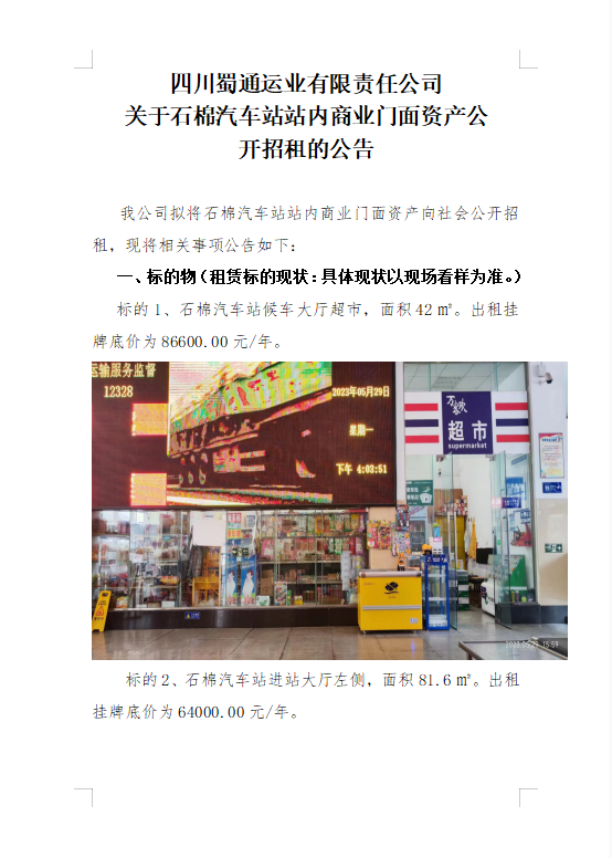 四川蜀通運(yùn)業(yè)有限責(zé)任公司關(guān)于石棉汽車站站內(nèi)商業(yè)門面資產(chǎn)公開招租的公告