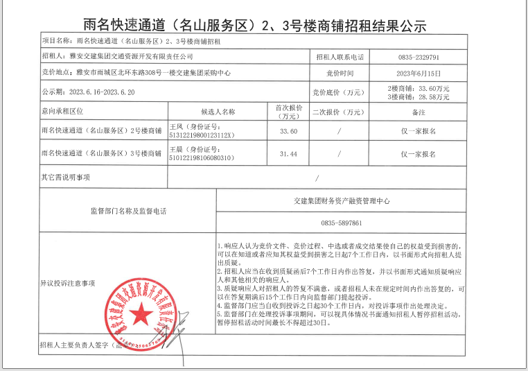 交通資源開發(fā)公司雨名快速通道(名山服務(wù)區(qū))2、3號(hào)樓商鋪招租結(jié)果公示