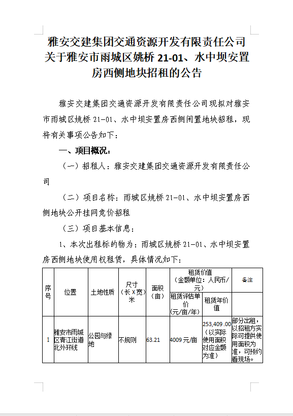 雅安交建集團交通資源開發(fā)有限責(zé)任公司關(guān)于雅安市雨城區(qū)姚橋21-01、水中壩安置房西側(cè)地塊招租的公告