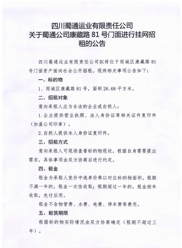 ËÄ´¨Êñͨß\˜I(y¨¨)ÓÐÏÞØŸ(z¨¦)Èι«Ë¾êP(gu¨¡n)ÓÚÊñͨ¹«Ë¾¿µ²ØÂ·81Ì–éTÃæßMÐÐ’ì¾W(w¨£ng)ÕÐ×âµÄ¹«¸æ£º¸½¼þ
