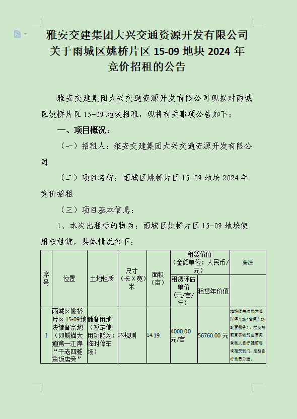 雅安交建集團(tuán)大興交通資源開發(fā)有限公司關(guān)于雨城區(qū)姚橋片區(qū)15-09地塊2024年競價(jià)招租的公告