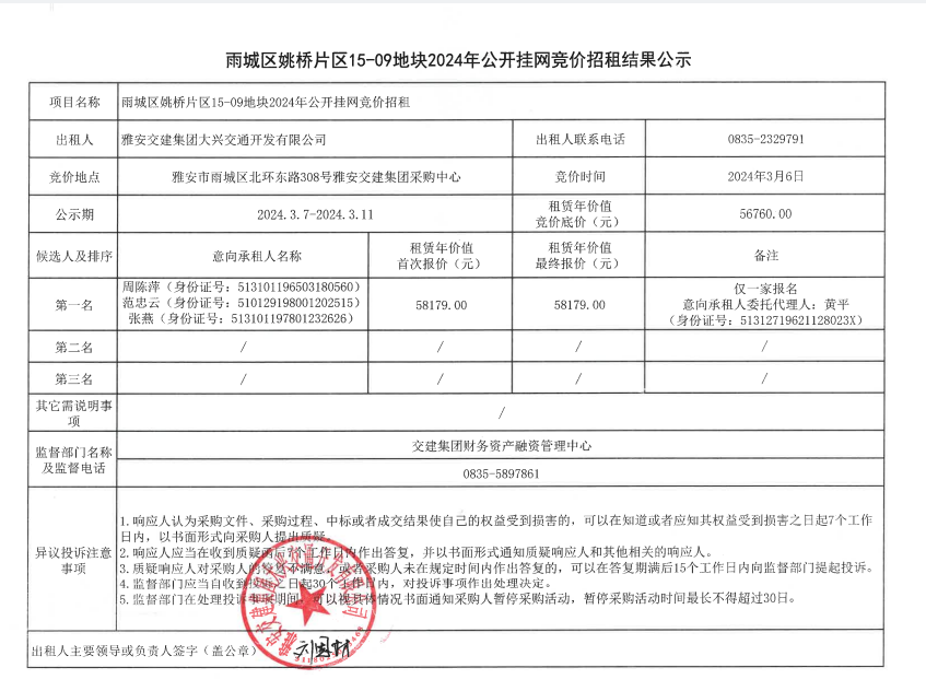雨城區(qū)姚橋片區(qū)15-09競價招租結果公示