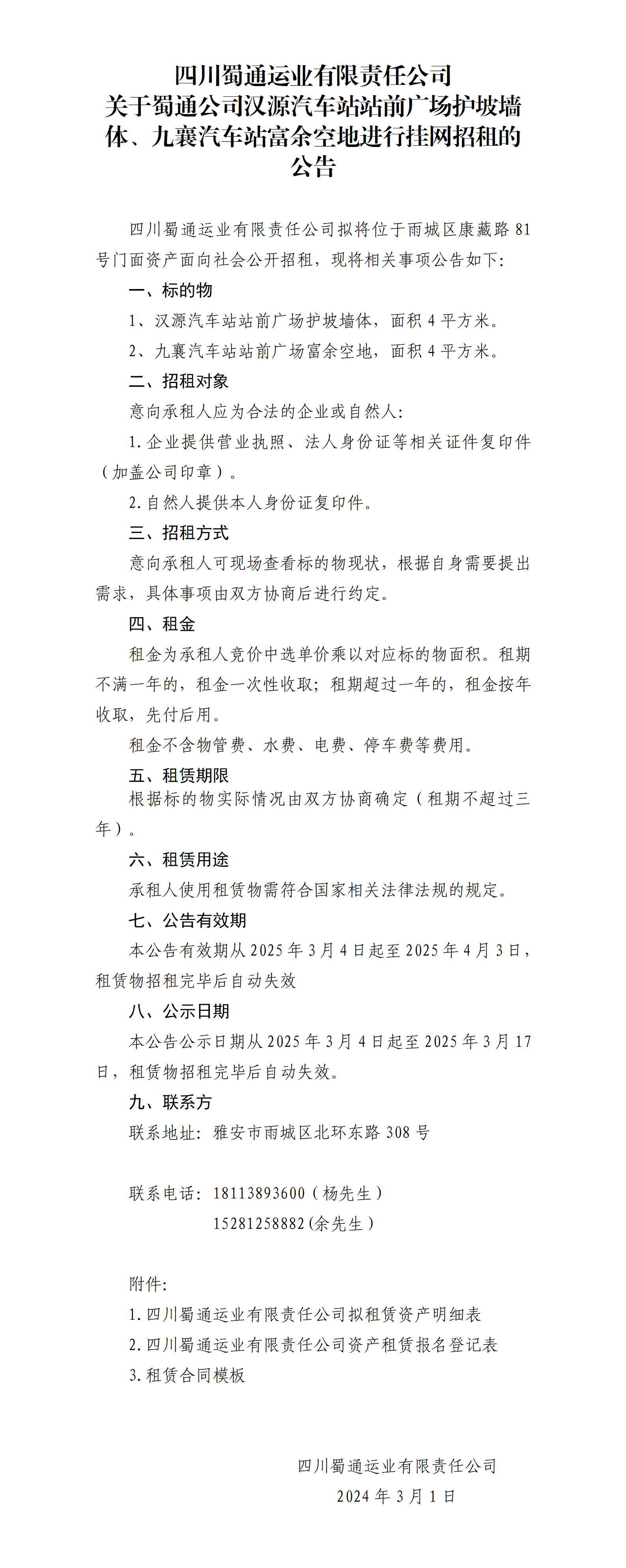四川蜀通運業(yè)有限責任公司 關于蜀通公司漢源汽車站站前廣場護坡墻體、九襄汽車站富余空地進行掛網招租的公告