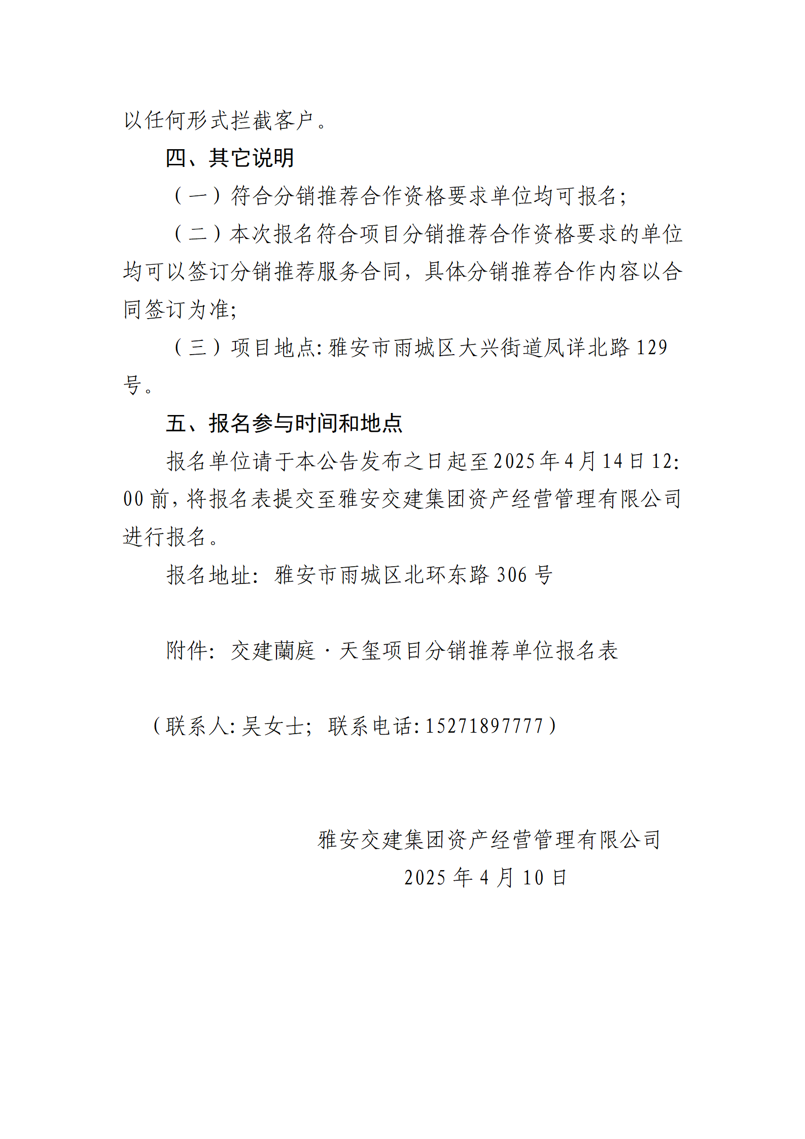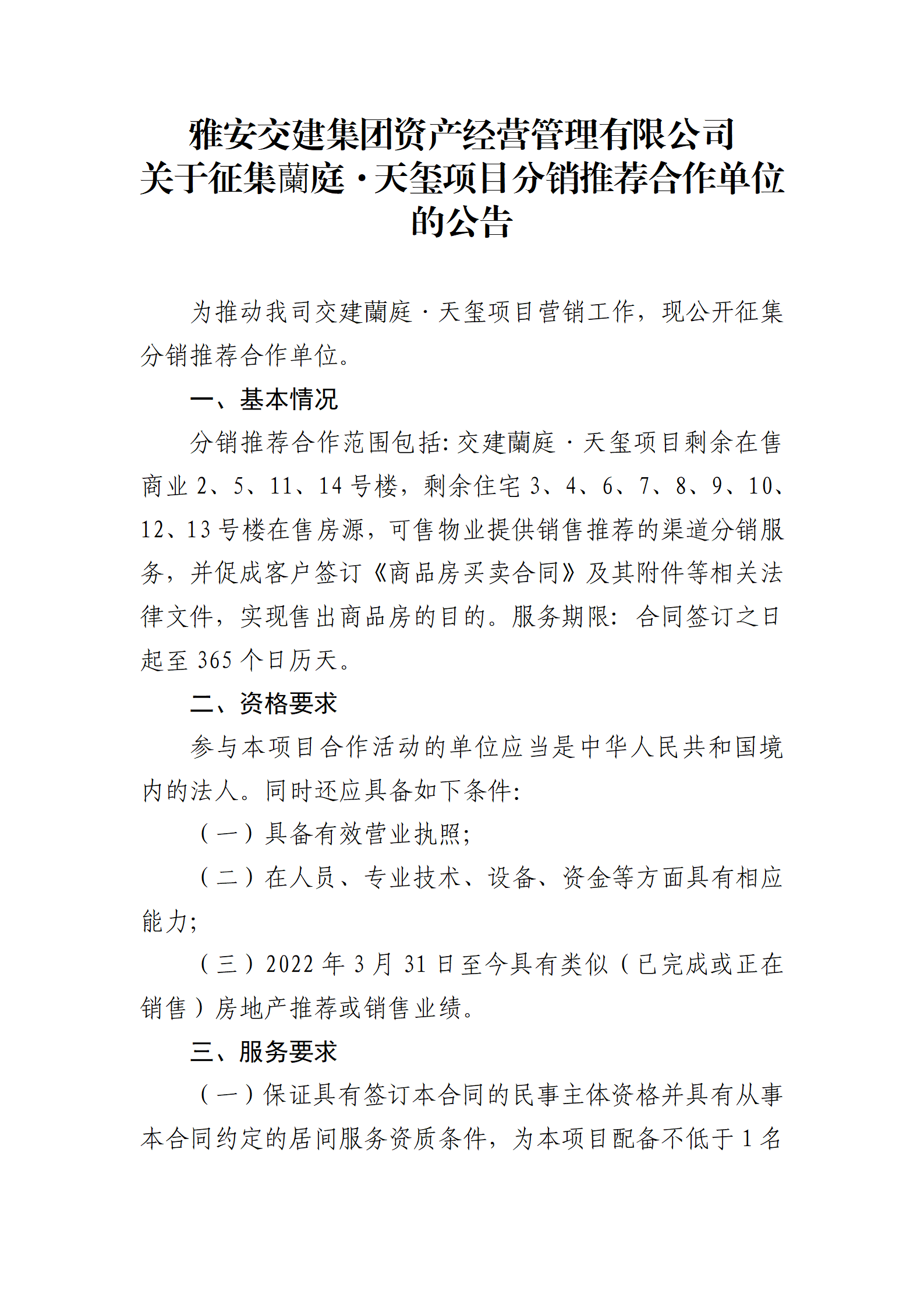 雅安交建集團資產(chǎn)經(jīng)營管理有限公司 關于征集蘭庭·天璽項目分銷推薦合作單位的公告