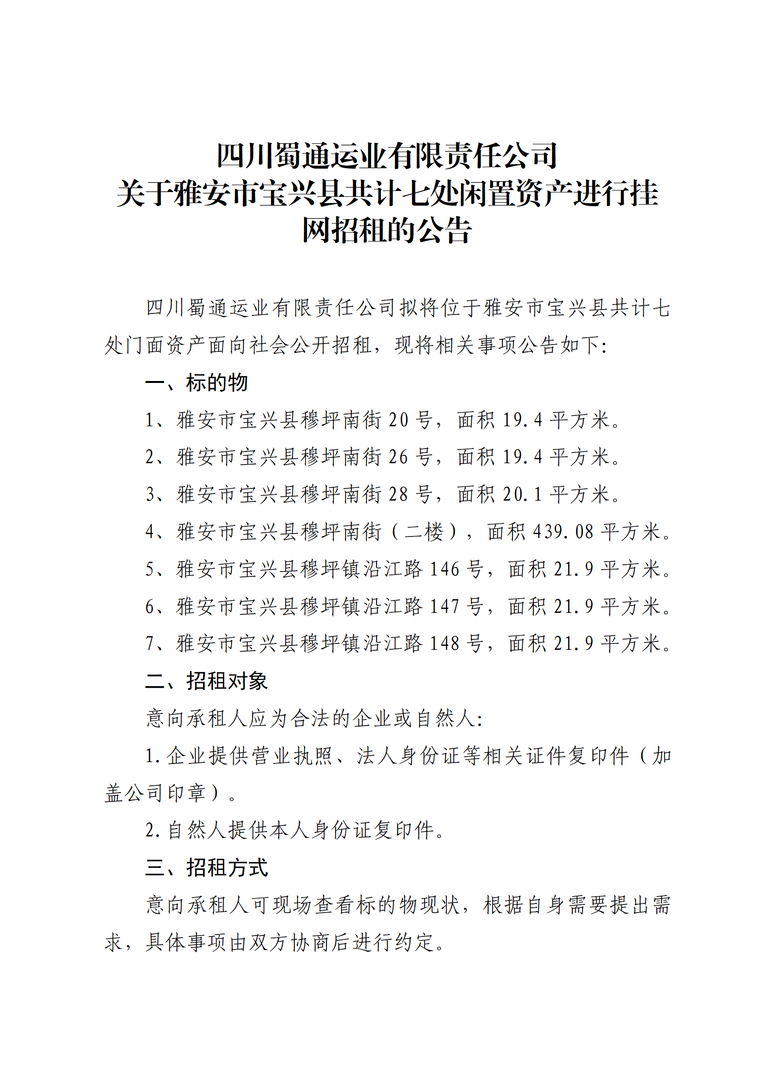 四川蜀通運業(yè)有限責(zé)任公司 關(guān)于雅安市寶興縣共計七處閑置資產(chǎn)進行掛網(wǎng)招租的公告