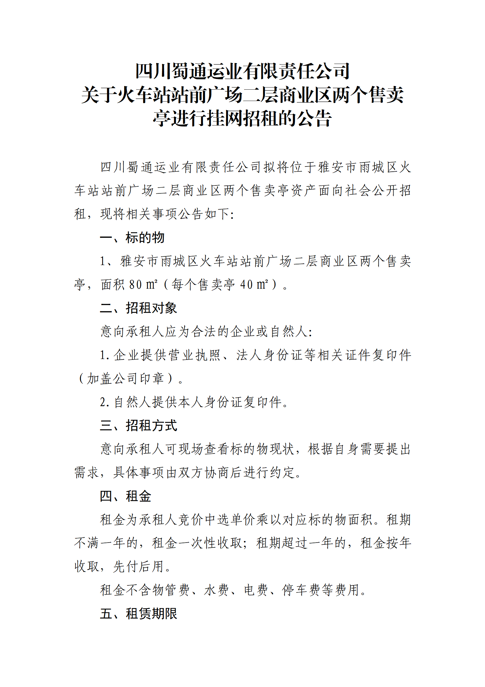 四川蜀通運業(yè)有限責任公司關(guān)于火車站站前廣場二層商業(yè)區(qū)兩個售賣亭進行掛網(wǎng)招租的公告