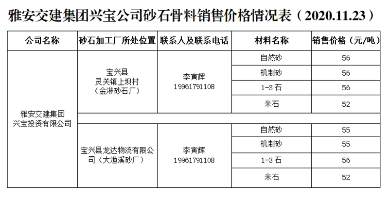 雅安交建集團興寶公司砂石骨料銷售價格情況表(2020.11.23)
