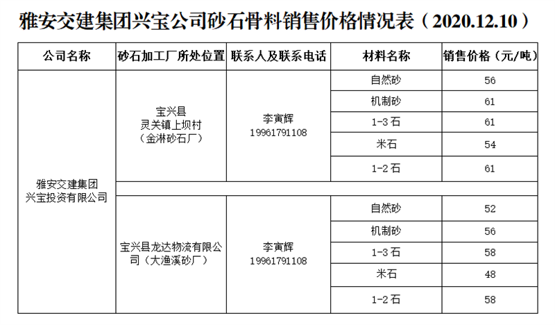 ÑŰ²½»½¨¼¯ˆFß\ͨ¹«Ë¾É°Ê¯¹ÇÁÏäNÊÛƒr¸ñÇé›r±í£¨2020.12.10£©