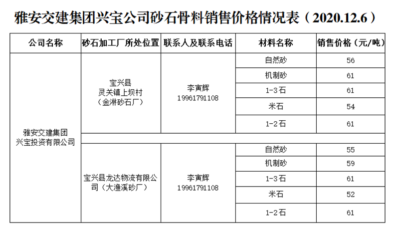ÑŰ²½»½¨¼¯ˆF(tu¨¢n)ÅdŒš¹«Ë¾É°Ê¯¹ÇÁÏäNÊÛƒr(ji¨¤)¸ñÇé›r±í£¨2020.12.6£©