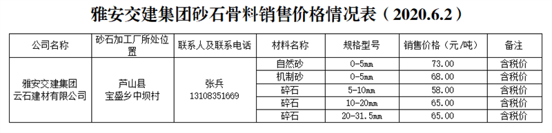 云石建材有限公司。云石公司是蘆山縣人民政府指定蘆山縣投資經(jīng)營(yíng)管理有限責(zé)任公司與雅安市交通建設(shè)(集團(tuán))有限責(zé)任公司共同組建的合資公司。公司在蘆山縣寶盛鄉(xiāng)中壩村建立砂石生產(chǎn)線,年產(chǎn)各類(lèi)砂石骨料約50萬(wàn)噸,生產(chǎn)廠區(qū)距雨城區(qū)中心城區(qū)約60公里。