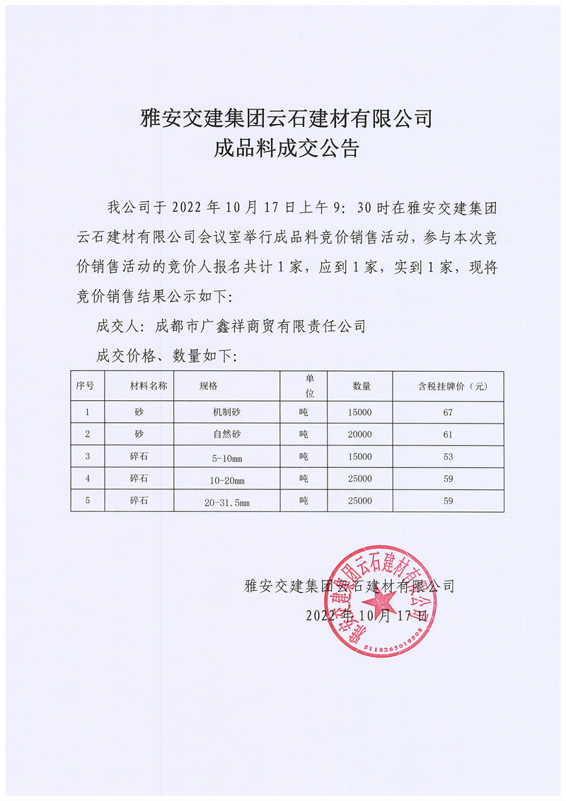ÑŰ²½»½¨¼¯ˆF(tu¨¢n)ÔÆÊ¯½¨²ÄÓÐÏÞ¹«Ë¾³ÉÆ·Áϳɽ»¹«¸æ10.17