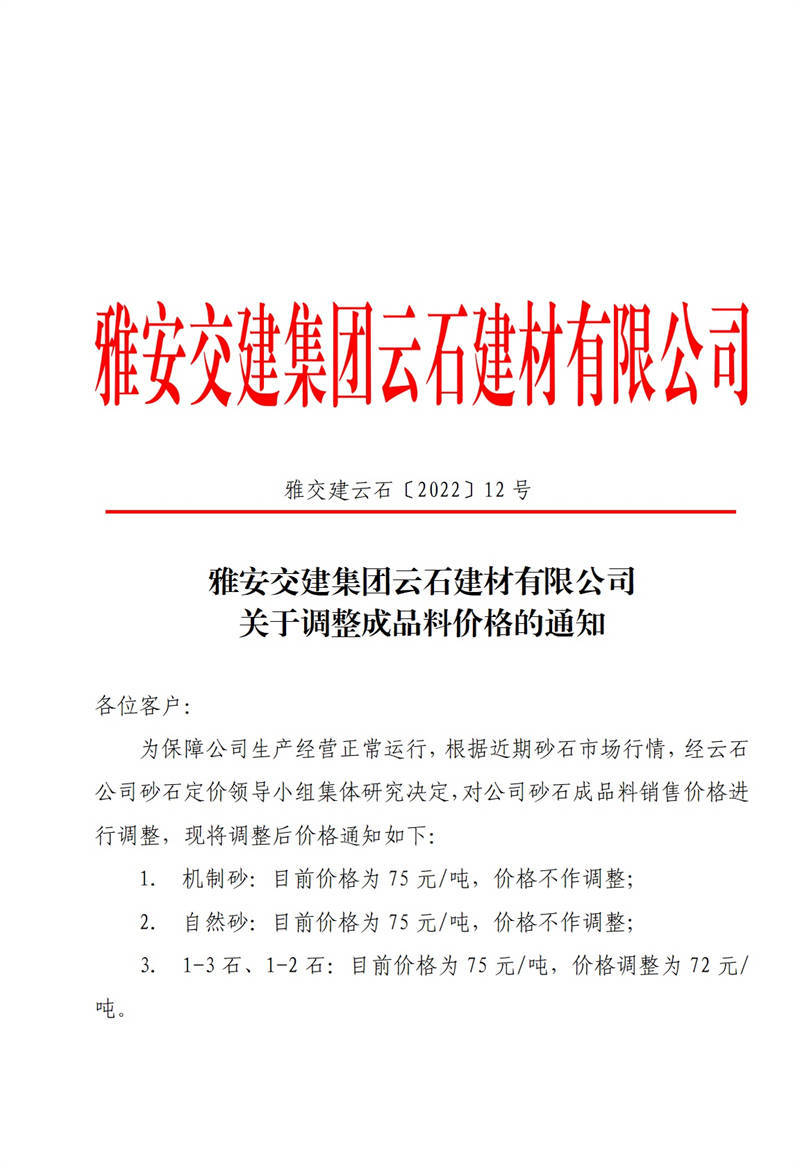 雅安交建集團(tuán)云石建材有限公司關(guān)于調(diào)整成品料價(jià)格的通知(2022-2-14)
