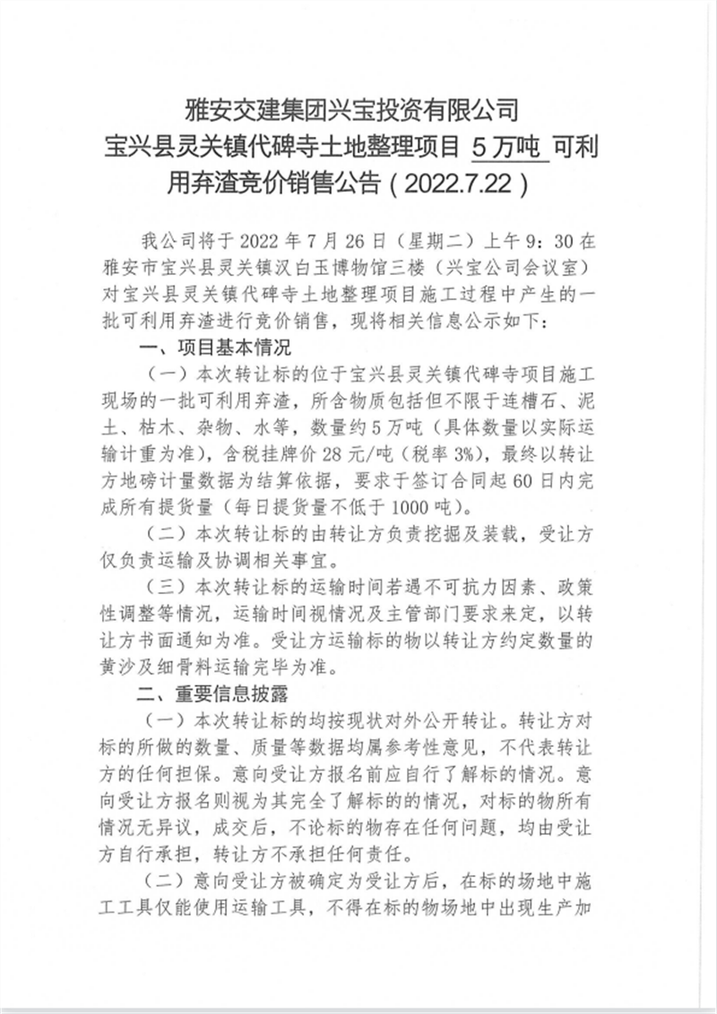 興寶公司寶興縣靈關(guān)鎮(zhèn)代碑寺土地整理項(xiàng)目10萬噸可利用棄渣競價銷售掛網(wǎng)公告掛網(wǎng)公告7.22(5萬噸)