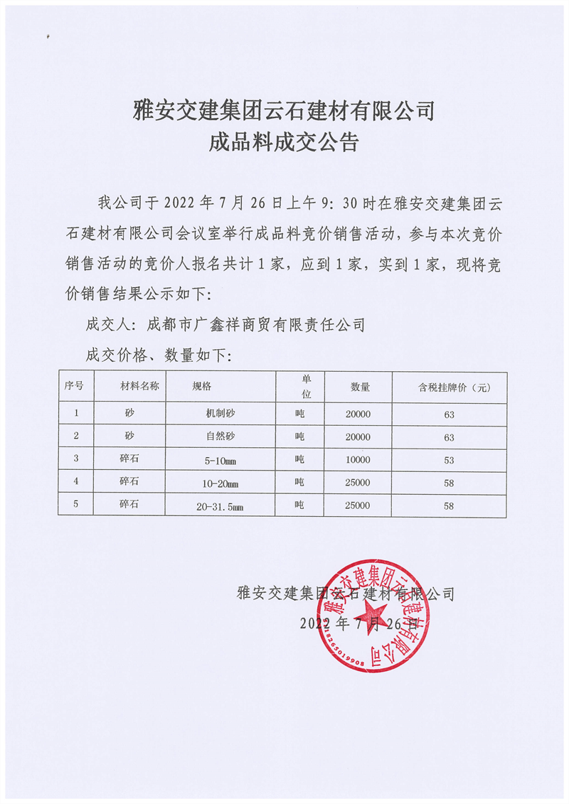 雅安交建集團云石建材有限公司成品料競價銷售成交公告7.26