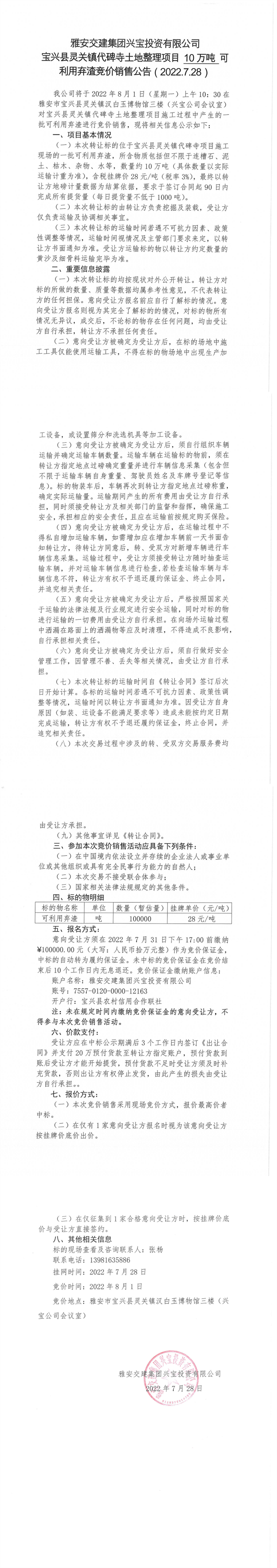 雅安交建集團(tuán)興寶投資有限公司靈關(guān)鎮(zhèn)代碑寺土地整理項(xiàng)目5萬噸可利用棄渣競(jìng)價(jià)銷售公告(2022.7.28)