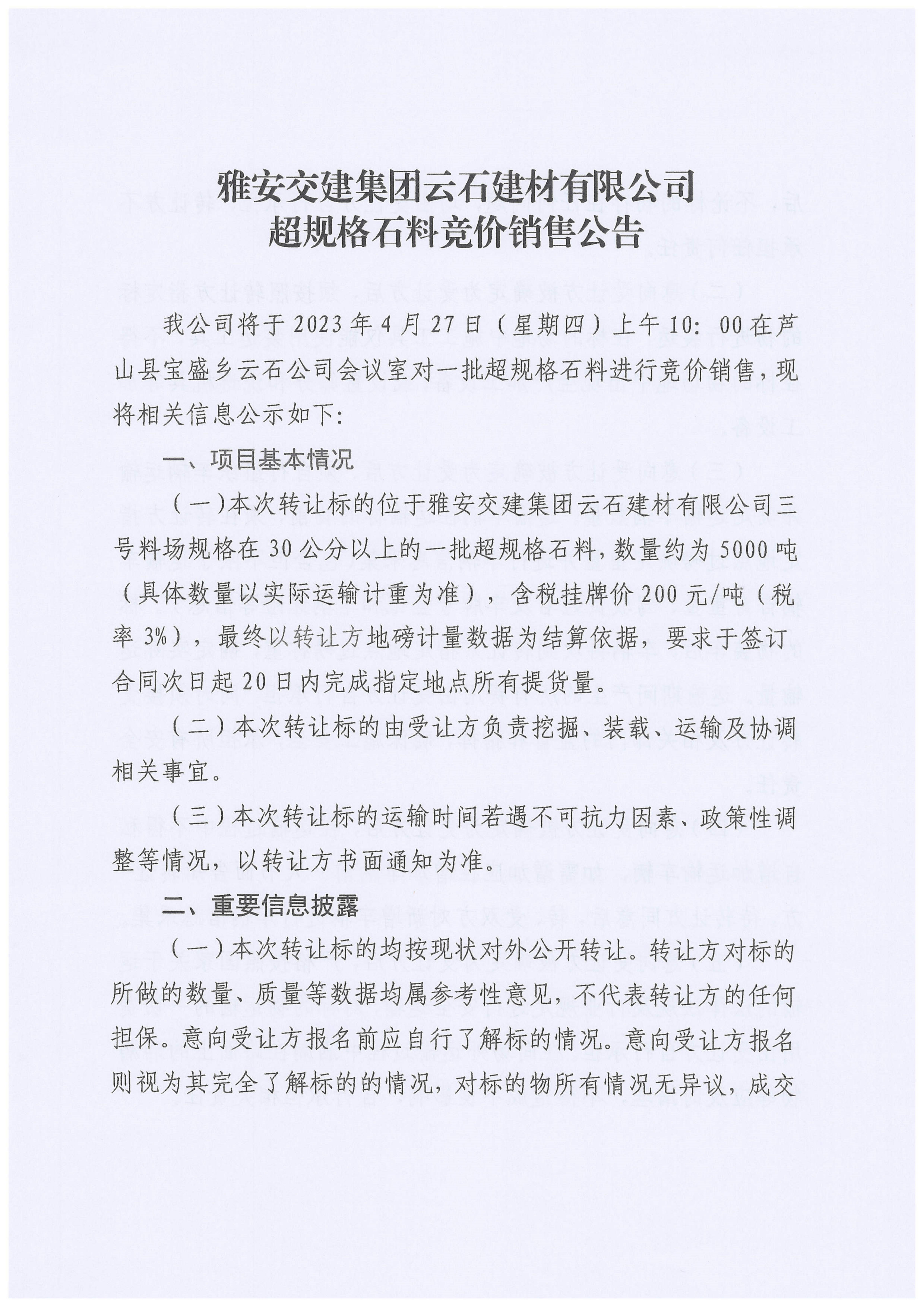 雅交建云石建材有限公司超規(guī)格石料競(jìng)價(jià)銷售公告(2023-4-24)