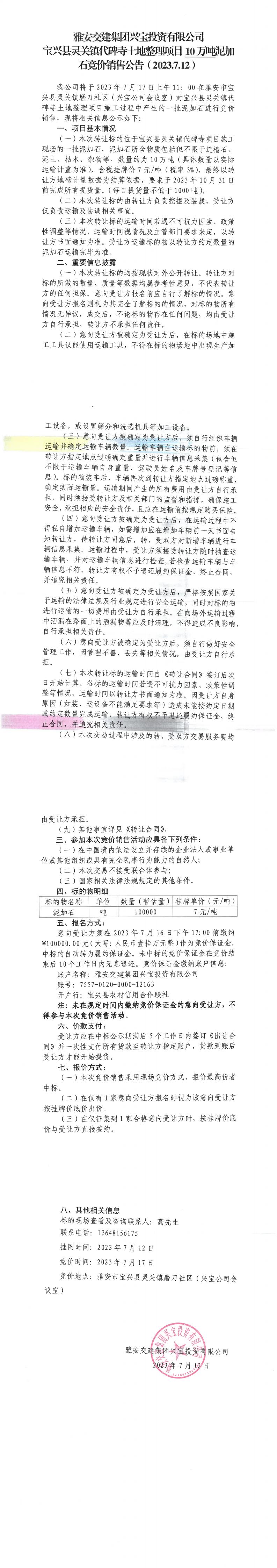 雅安交建集團(tuán)興寶投資有限公司寶興縣靈關(guān)鎮(zhèn)代碑寺土地整理項(xiàng)目10萬噸泥加石競價(jià)銷售公告(2023.7.12)